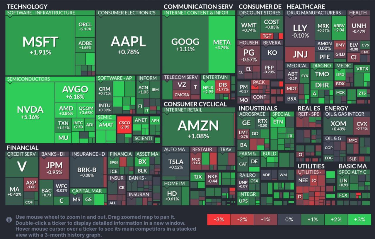 - 반도체와 기술 섹터 강세. 반면 유틸리티, 필수 소비재 등 경기 방어 섹터 약세.