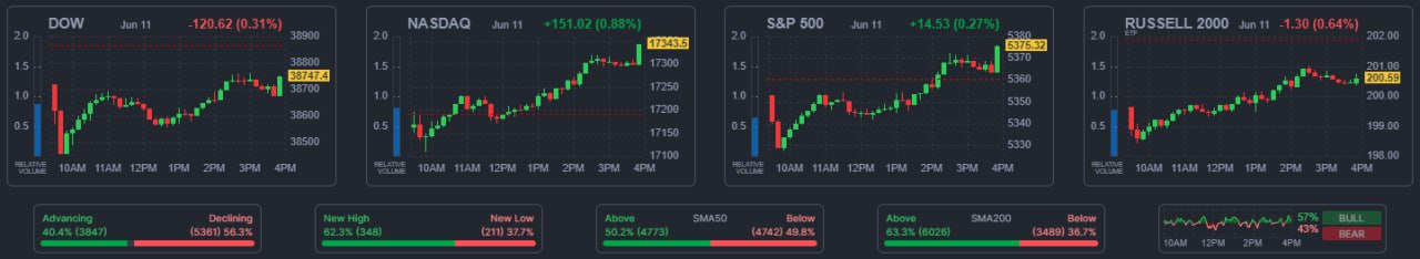 - 06/12 나스닥, 애플의 급등과 금리 하락 속 상승 전환 후 폭이 확대