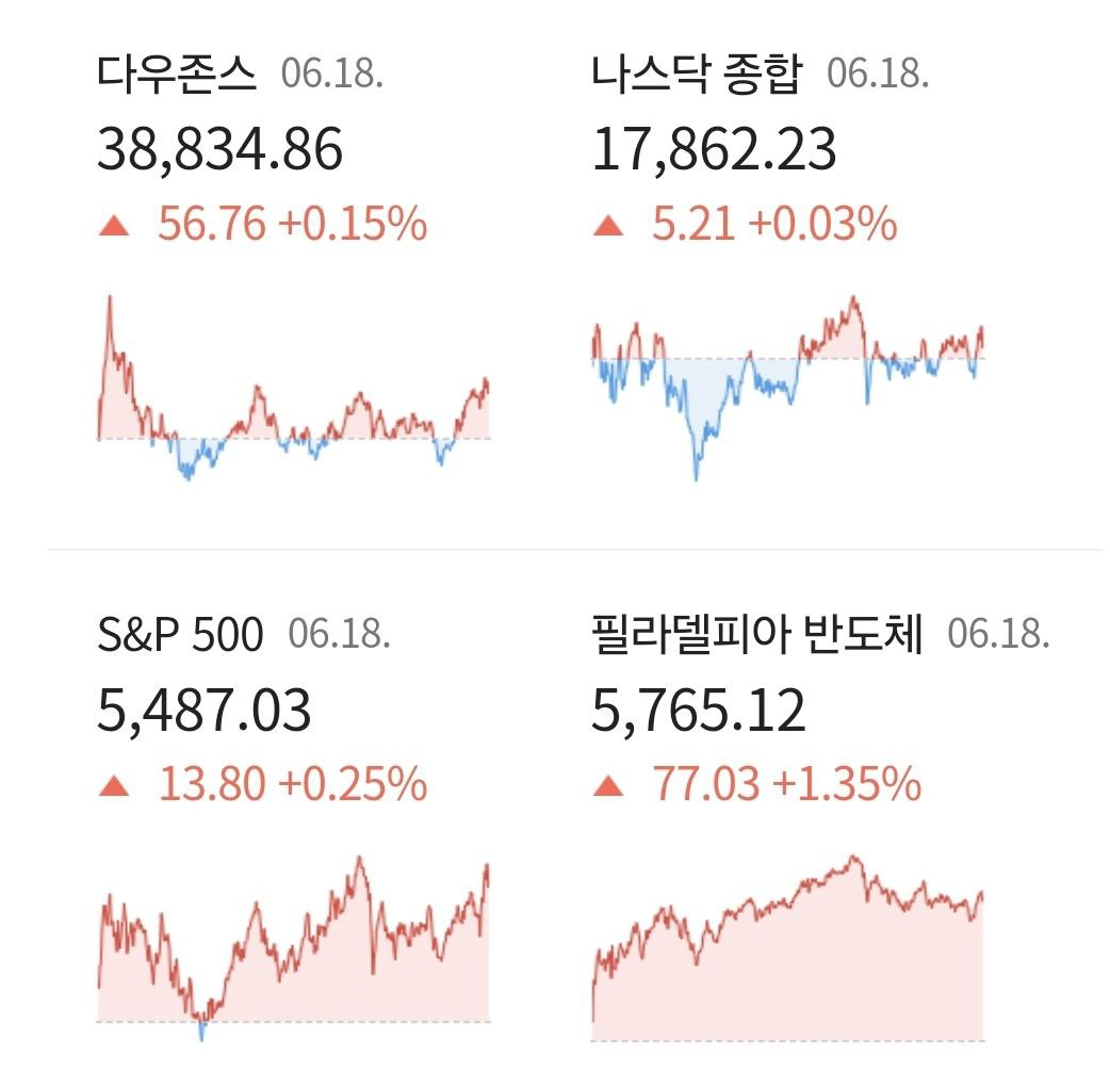 - 06/19 미 증시, 경기 둔화 우려 불구 엔비디아 시가총액 1위의 힘으로 강보합 마감