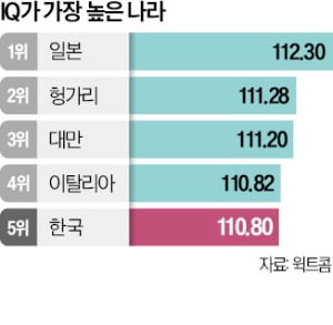 1. 세계서 5번째로 머리 좋은 나라 한국 → 핀란드 지능 테스트 기관 조사. 한국인 IQ 110.8, 1위는 112.30을 기록한 일본, 다음으로 헝가리(111.28, 2위) 대만(111.20, 3위) 이탈리아(110.82, 4위) 순. 독일(105.23, 23위), 인도(99.39)는 50위, 미국(96.57)은 77위.(한경)▼