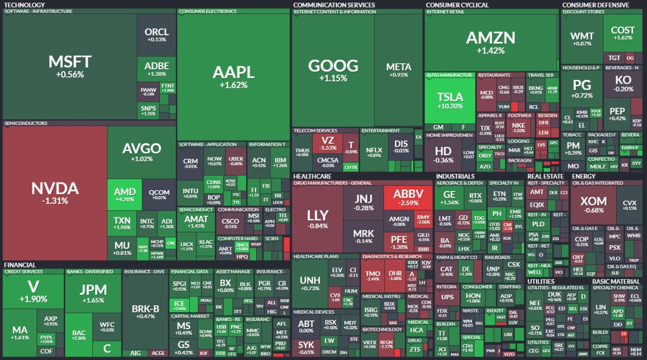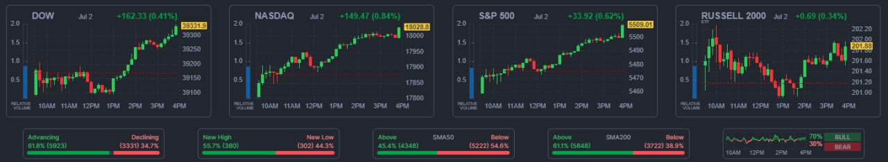 - 엔비디아 $NVDA 를 제외한 매7 전 종목 상승. 테슬라 $TSLA 는 예상치를 상회한 2분기 차량 인도량에 힘입어 10% 상승.