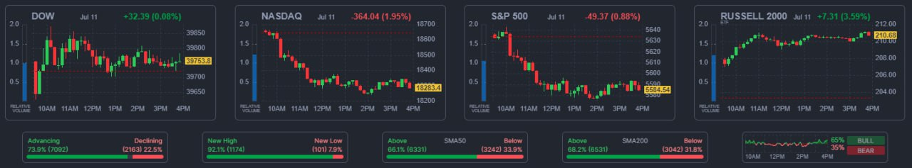 - 오늘 시장은 급격한 섹터 로테이션을 보여줬는데 그동안 상승을 주도하며 과매수 구간에 있던 매7 + 반도체, AI 종목들이 급락한 반면 나머지 섹터와 중소형 종목들이 급등. 특히 금리 인하에 수혜를 보는 부동산, 유틸리티 등의 섹터와 중소형주들은 10% 이상 상승한 종목이 수두룩할 정도. 시장이 뭔가 변곡점에 선 듯한 분위기.