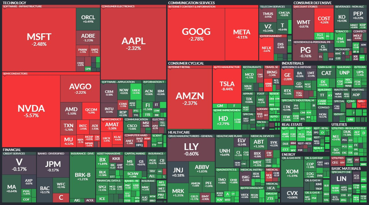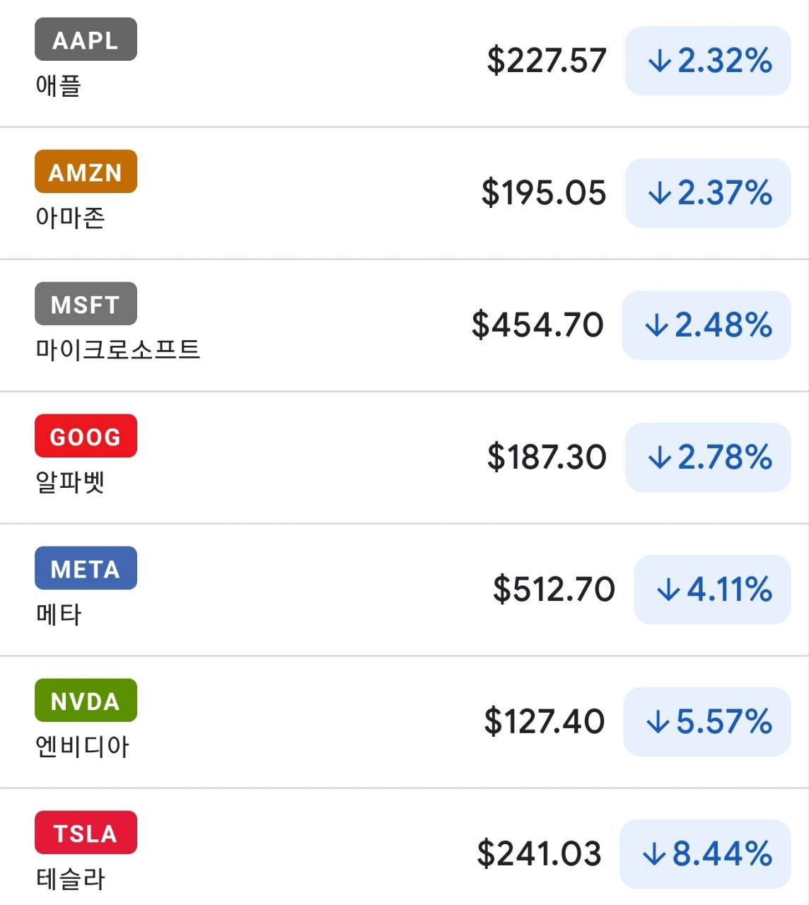 - 애플 -2.3%, MS -2.5%, 엔비디아 -5.6%, 테슬라 -8.4%