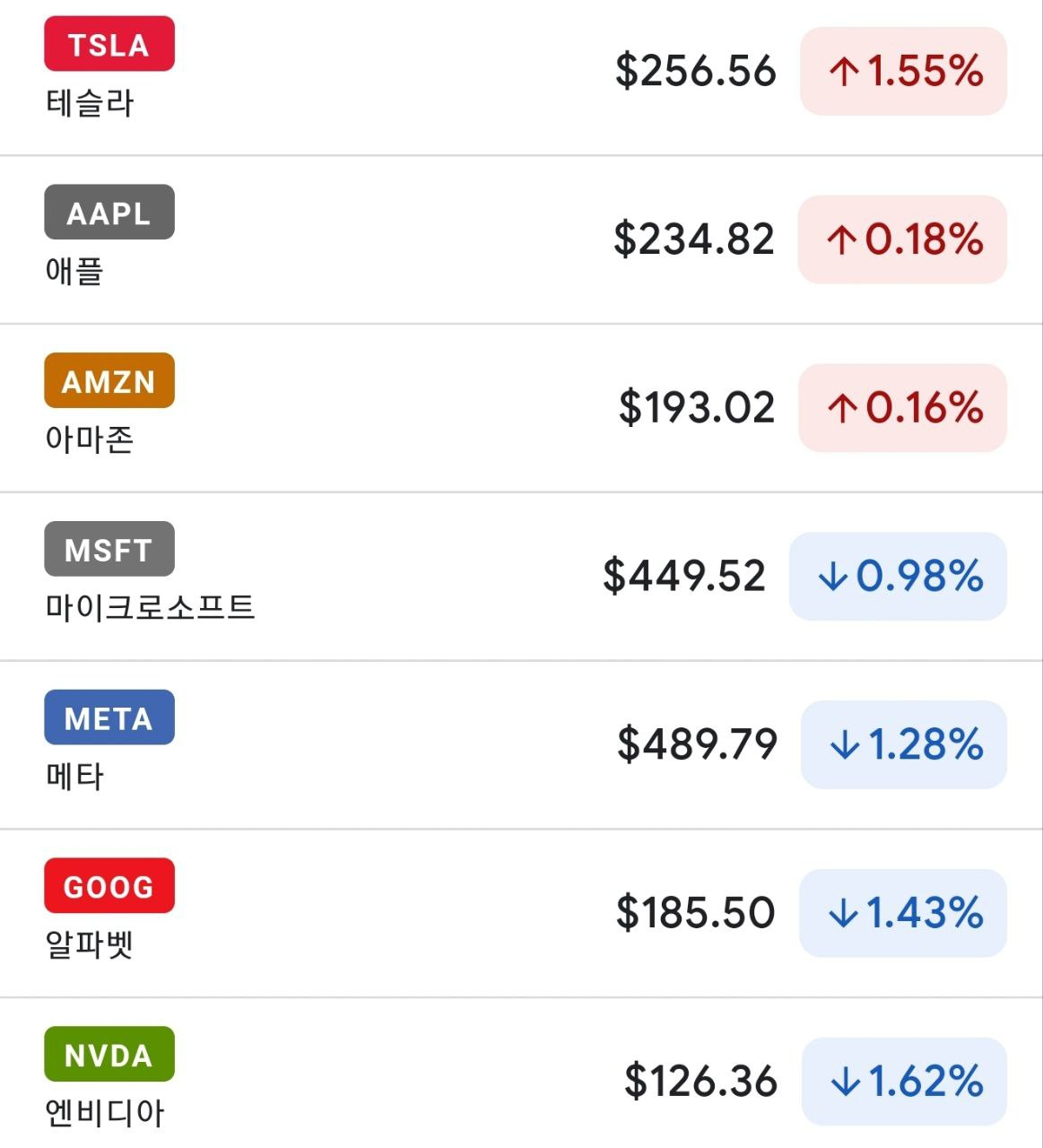 - 매그니피센트7 가운데 애플과 아마존 제외한 엔비디아, 마이크로소프트, 알파벳, 테슬라, 메타 하락세로 마감