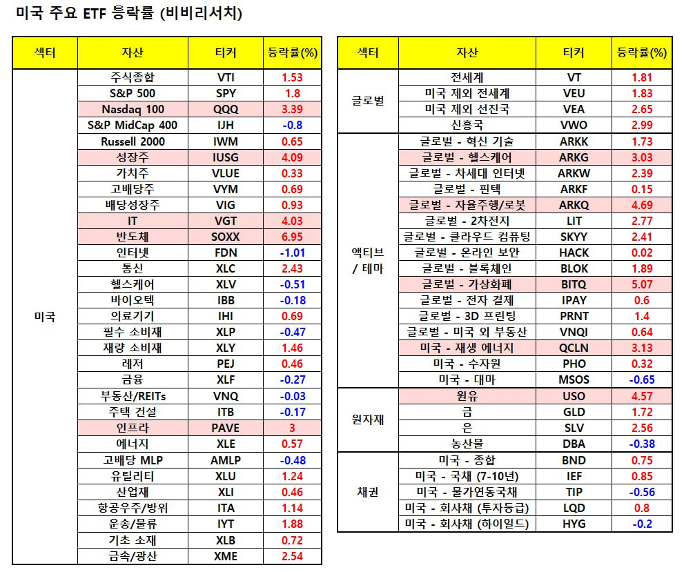 - 브로드컴(+11.96%), TSMC(+7.29%), ASML(+8.99%), AMAT(+7.86%)등 반도체 관련 종목군이 큰 폭 상승.