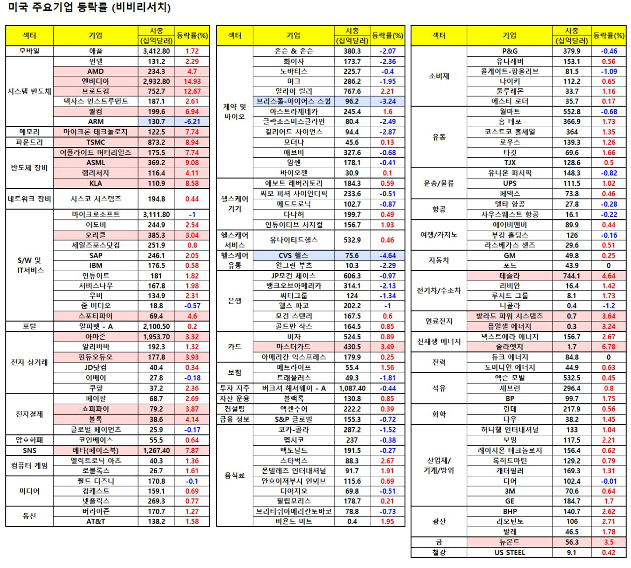 - 브로드컴(+11.96%), TSMC(+7.29%), ASML(+8.99%), AMAT(+7.86%)등 반도체 관련 종목군이 큰 폭 상승.