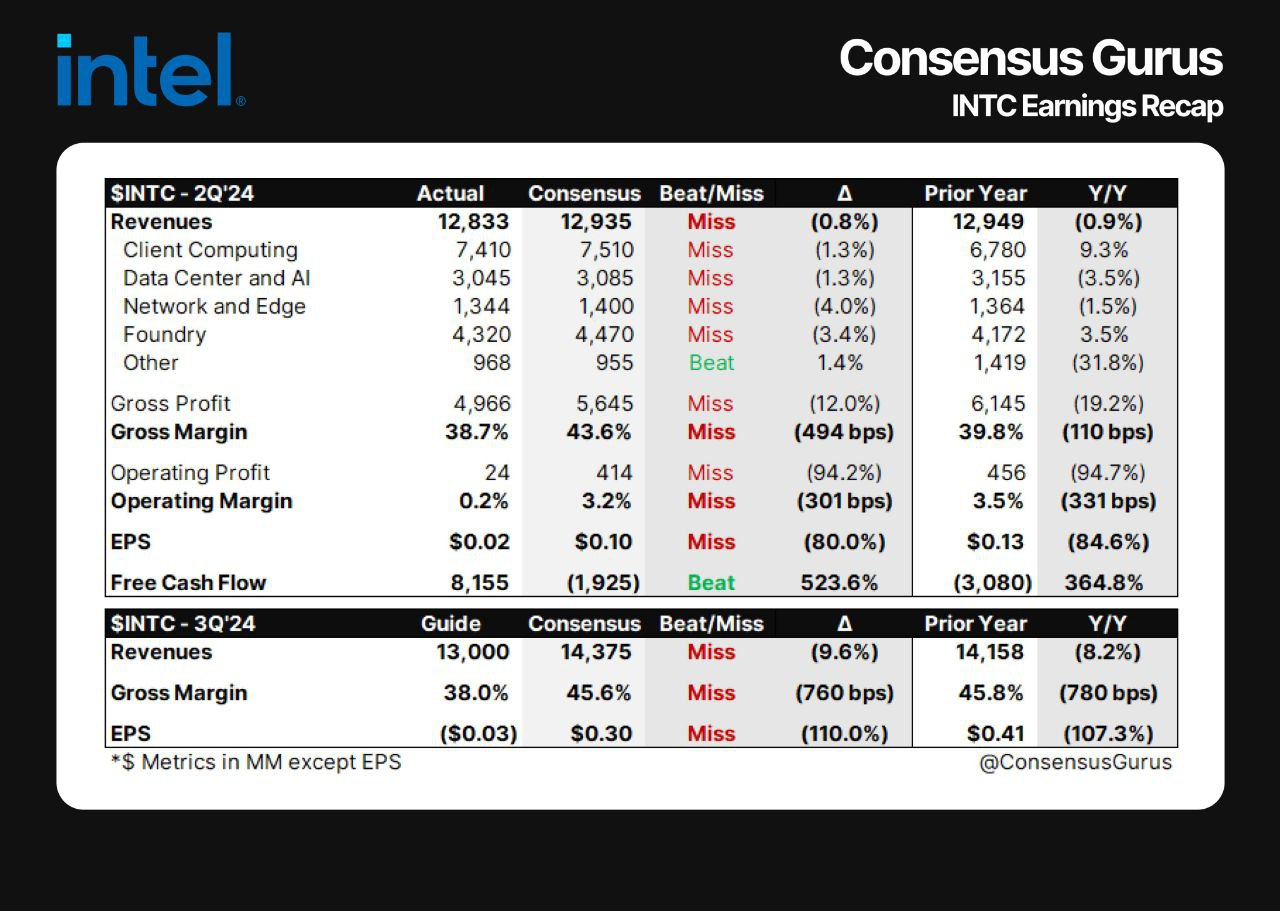 - 美 인텔 2분기 실적 시장 예상 하회…시간외 주가 20% 폭락