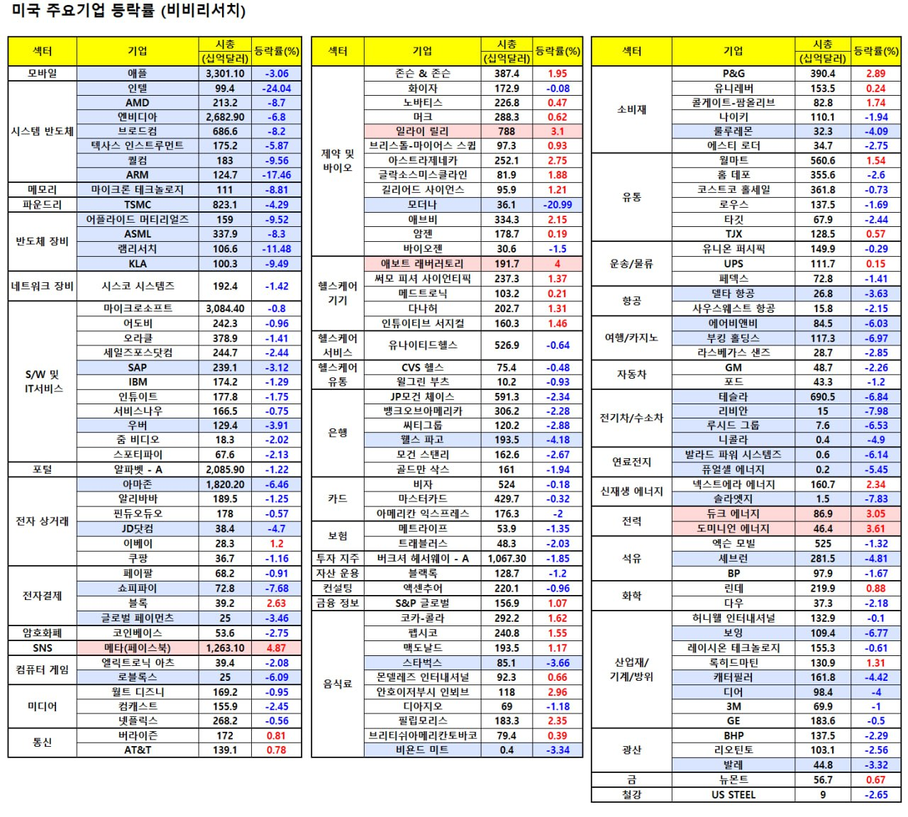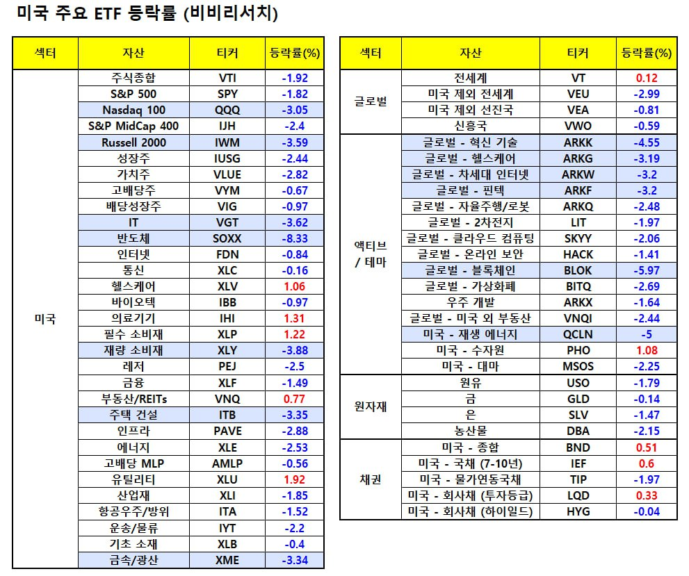 - 테슬라(-6.55%), 아마존(-1.6%), 애플(-1.7%)등 빅테크 기업들은 하락세 보임.