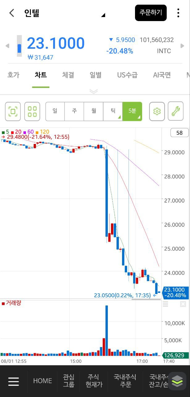 - 인텔은 실적이 컨센을 하회했고 4분기부터 배당을 중단하며 인력 감축을 발표한 후 -20% 급락 중입니다/