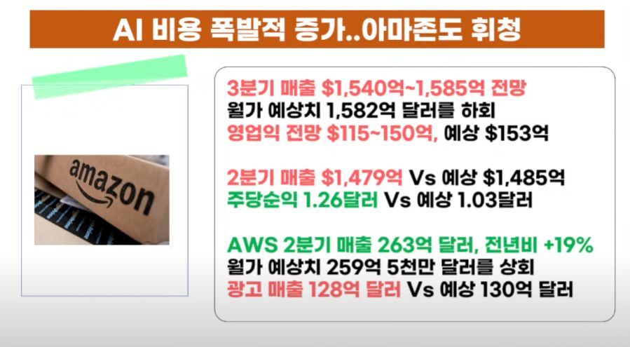 - 장 마감 후 실적을 발표한 아마존은 클라우드 부문은 좋았으나 매출과 가이던스 실망으로 현재 시간 외에서 -4% 하락 중입니다/