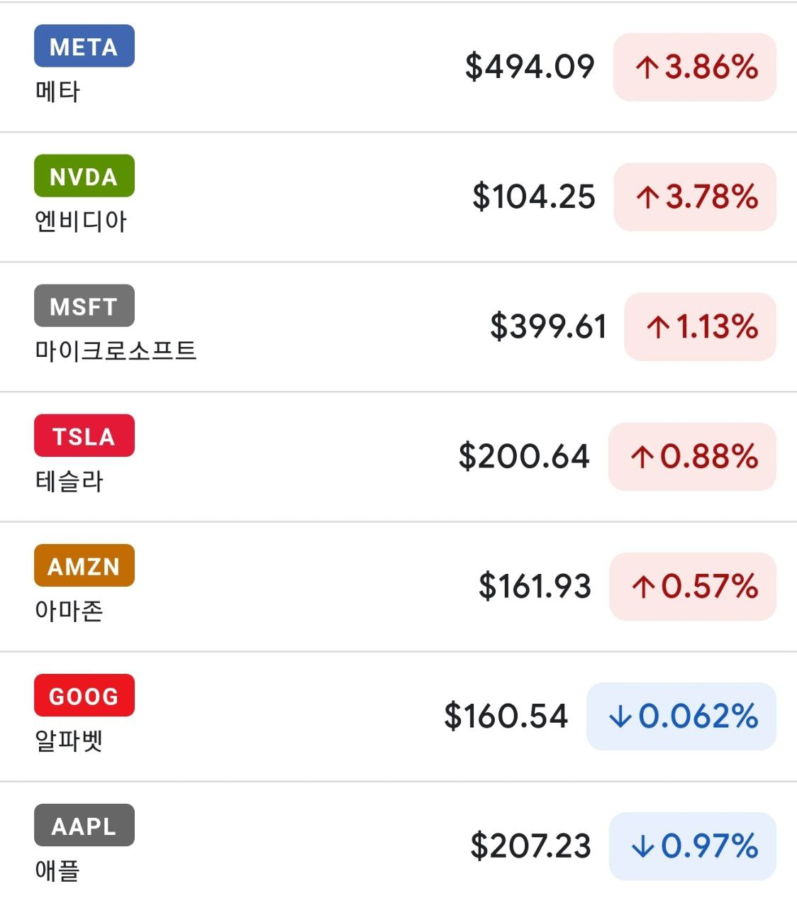 - 엔비디아와 메타는 4% 가까이 상승. 그 밖에도 대형 기술주들이 상승하는 모습.