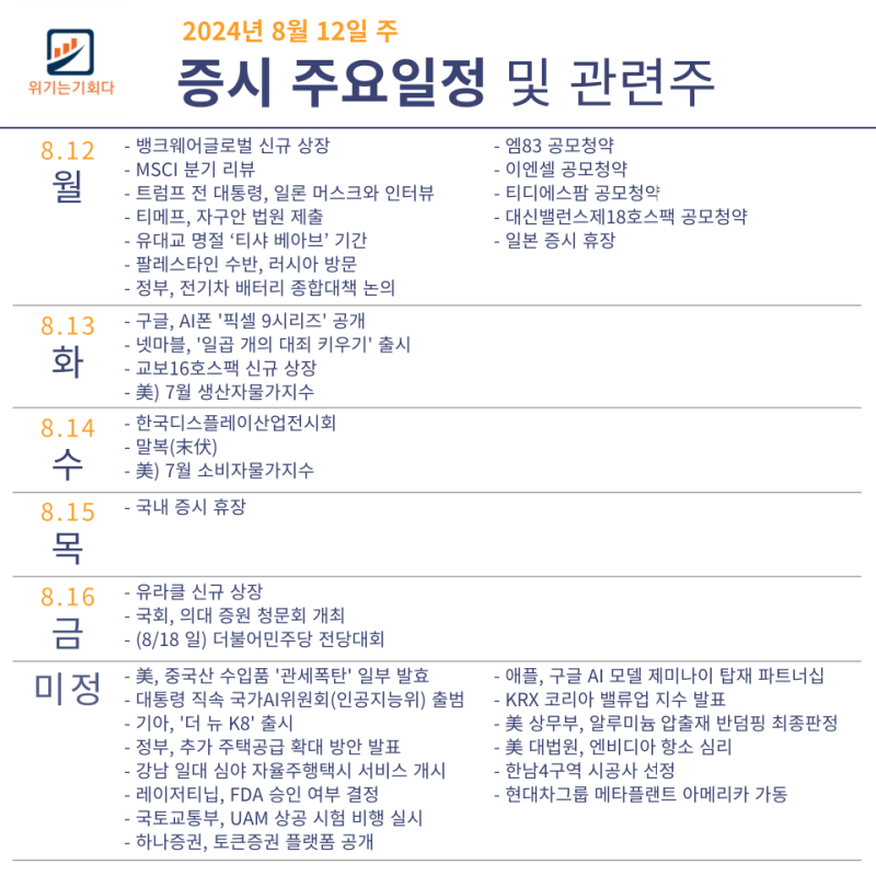 - 수요일 발표될 7월 미국 소비자물가지수(CPI)와 목요일의 소매 판매 데이터가 주목받을 것이며, 화요일에 발표될 7월 생산자물가지수(PPI)는 인플레이션 압력을 예고할 수 있는 지표로 작용할 수 있다.