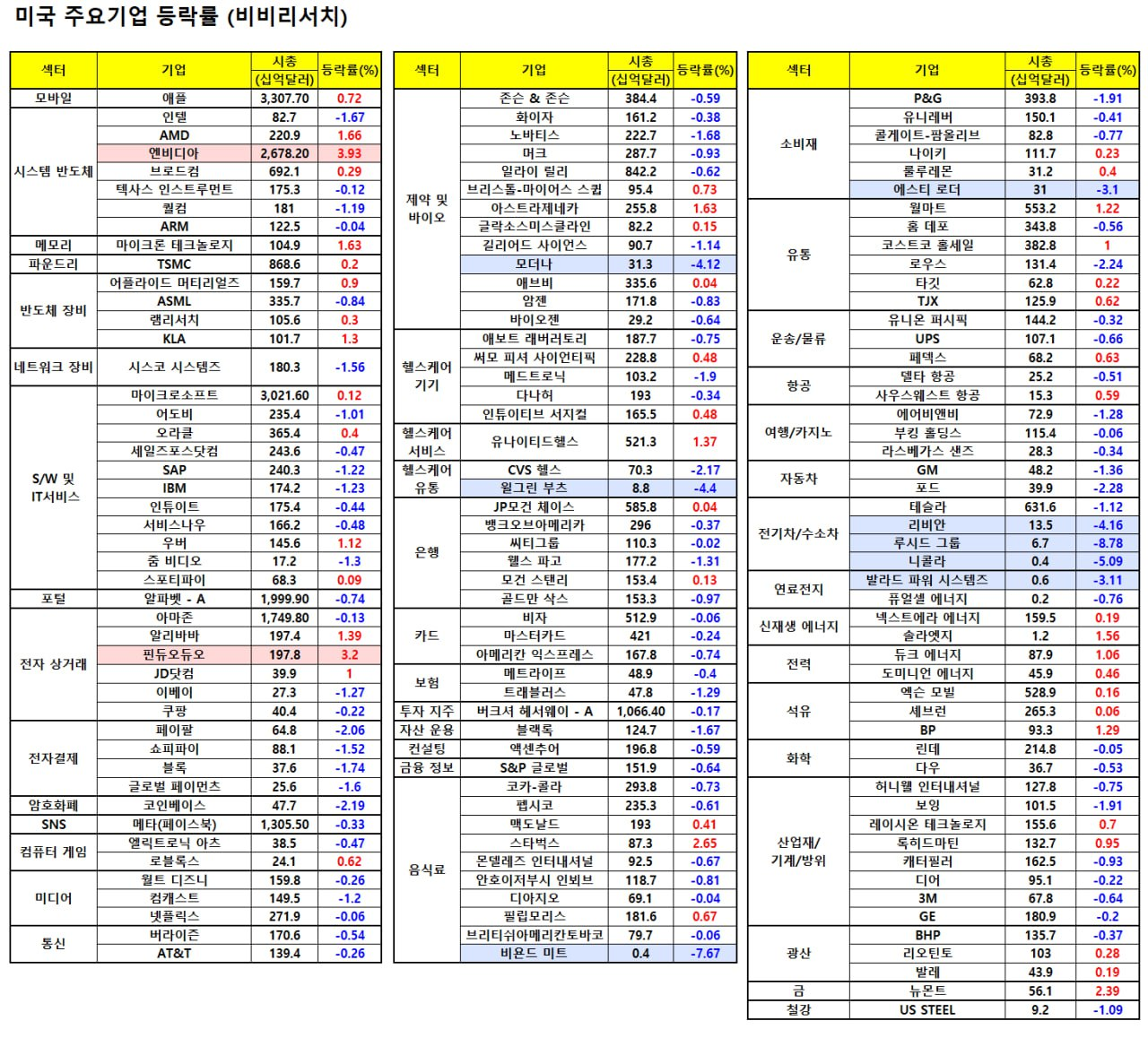 - 특징 종목: 엔비디아 상승 Vs. 테슬라 부진