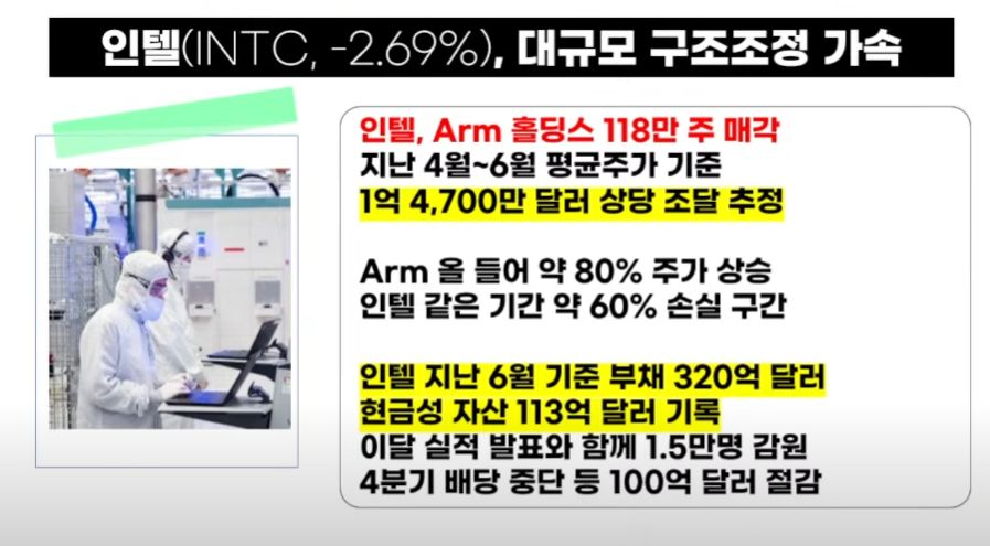 - ARM(+1.72%)은 인텔(-2.69%)이 보유지분을 매도하자 수급 우려 완화되며 상승.