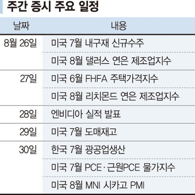 - 이번주 미국 주식시장에서 가장 주목받는 일정은 오는 28일(현지시간) 공개되는 엔비디아의 실적과 30일 발표되는 7월 개인소비지출(PCE) 물가지수다.