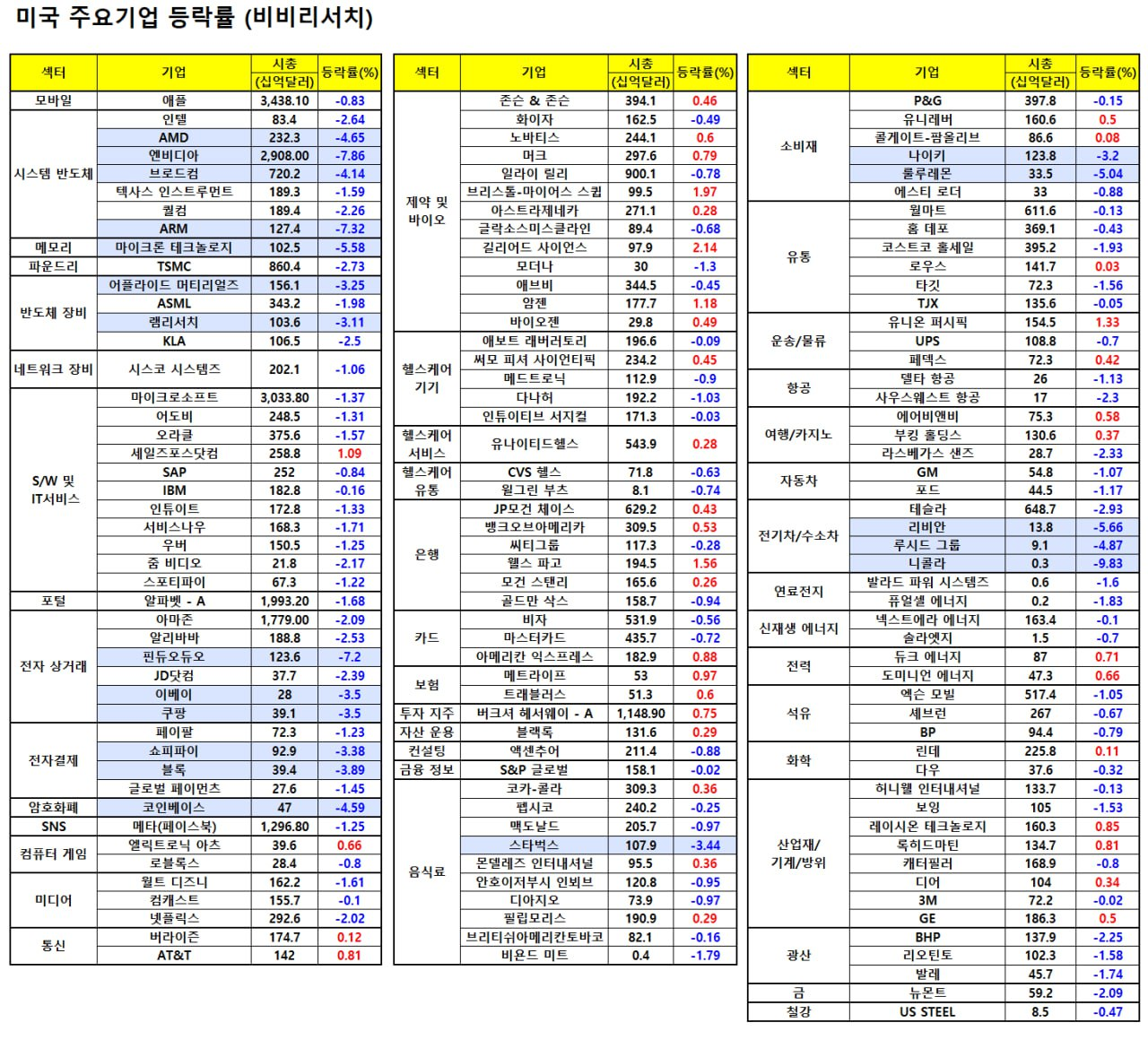 - 이에 AMD(-2.75%), TSMC(-0.79%), ARM(-4.48%), 브로드컴(-2.00%), 마이크론(-3.07%) 등 대부분 반도체 종목이 하락했으며, 장 마감 후에도 1~3%대 하락 중.
