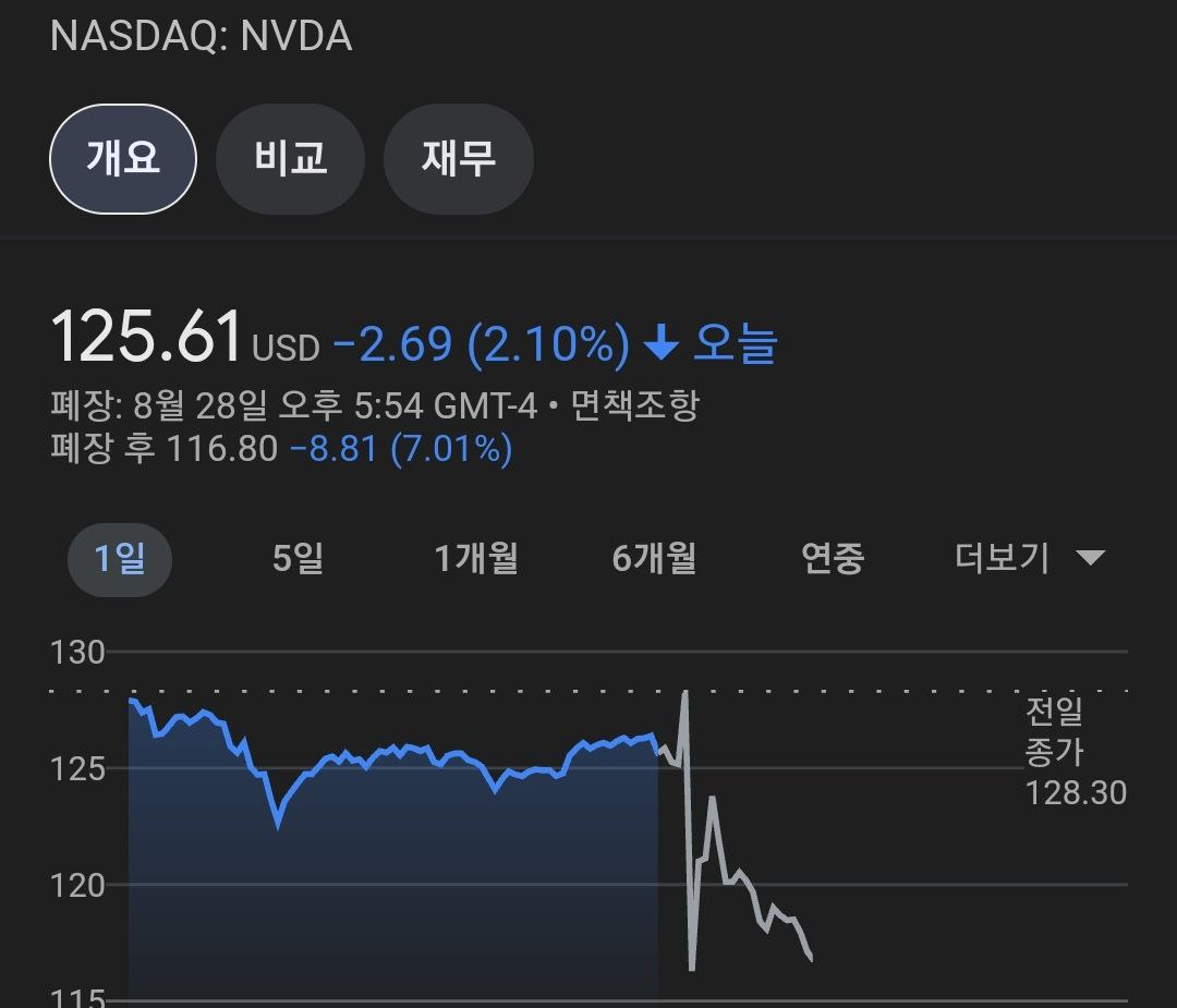 - 엔비디아 호실적에 전망도 밝고 예상치 넘어섰지만 눈높이 못채운 엔비디아 실적 시외 -7%대 하락중