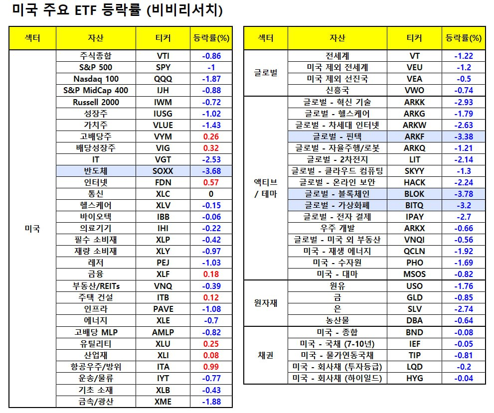 - 필라델피아 반도체 지수는 1.83% 하락. 이를 추종하는 iShares 반도체 ETF(SOXX)도 1.80% 하락. 시간외로 SOXX는 1% 내외 하락 중.