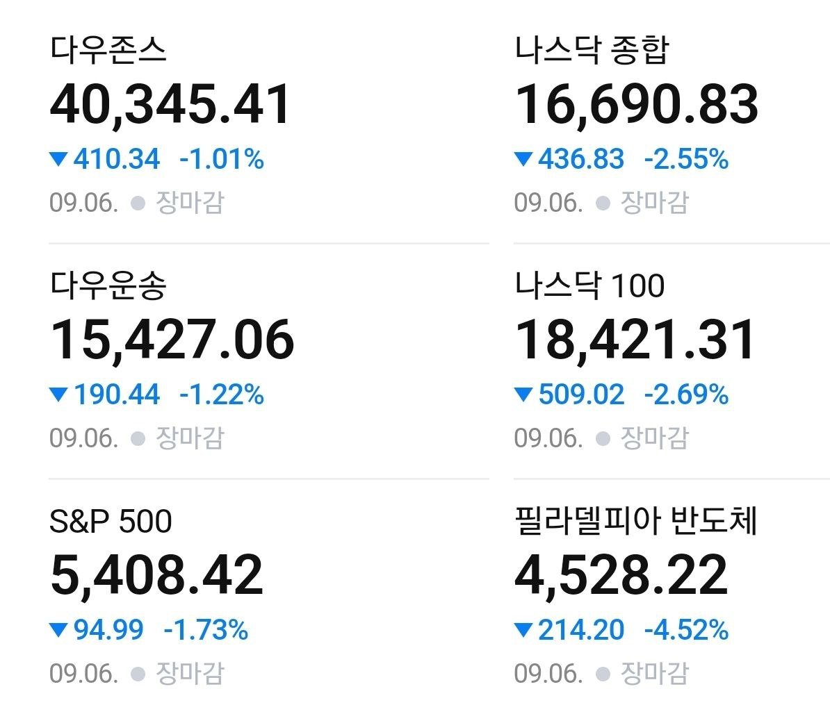 - 09/09 미 증시, 고용보고서 결과에 상승 출발 후 반도체 중심으로 매물 쏟아지며 하락