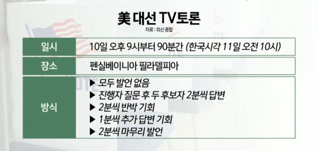 - 해리스 VS 트럼프, 세기의 TV토론, 10일 오후 9시(한국시간 11일 오전 10시)