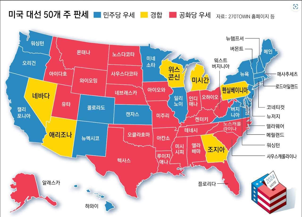 7. 美 대선 예측 더 어려워져 → 해리스 9월 들어 더 못 치고 나가. 7개 경합주 여론조사마다 초박빙. 초박빙 지지율에 미국 선거제도의 복잡성 때문에 더욱 예측 불가의 상황. 미국은 단순 다수 득표자가 당선되는 것이 아니라 주별로 다수 득표 후보가 선거인단을 독식하는 승자독식제도를 채택하고 있어 예측 모델이 더 복집해 진다고.(국민)