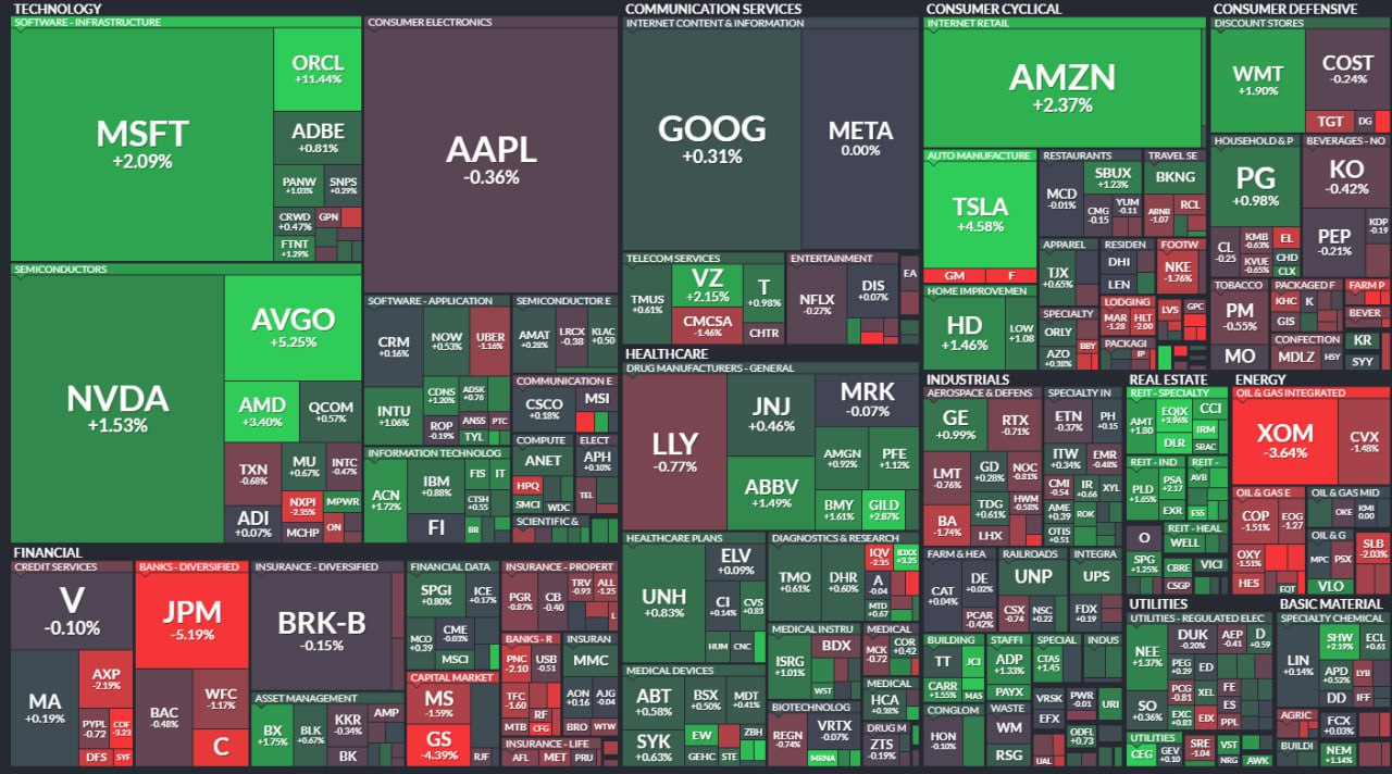 - 오라클(+11.44%)은 실적 발표에서 예상을 상회한 가이던스 발표에 힘입어 급등.