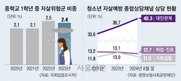 4. 초4부터 불행해지는 아이들 → 초등학교 4학년부터 학업 스트레스와 수면 부족 등으로 정신건강에 적신호가 켜지고 중학교 1학년이 되면 자살 시도율 최고. 중고등학생의 자살 시도 경험률은 2014년에는 4.44%에서 지난해에는 5.26%로 높아져. 국회입법조사처. ‘학생의 정신건강 실태와 향후 과제’.(서울)▼