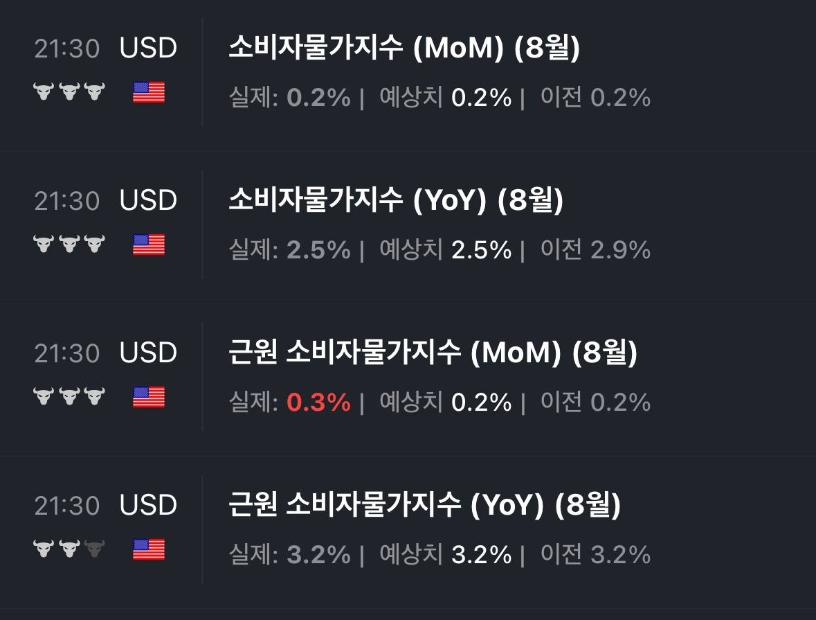 - 미국 8월 소비자 물가지수는 전월 대비 0.15%에서 0.19%로 상승했지만 전년 대비로는 2.89%에서 2.53%로 둔화.
