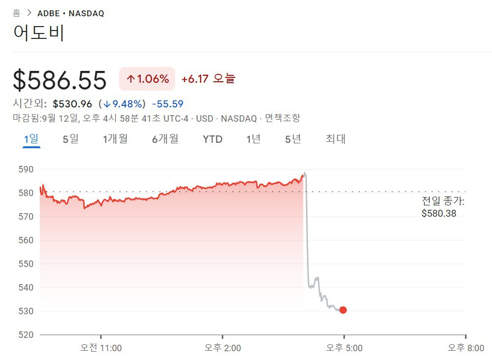 - 어도비(+1.06%)는 양호한 실적에도 기대 매출 예상 하회하자 시간 외 8%대 넘게 급락.
