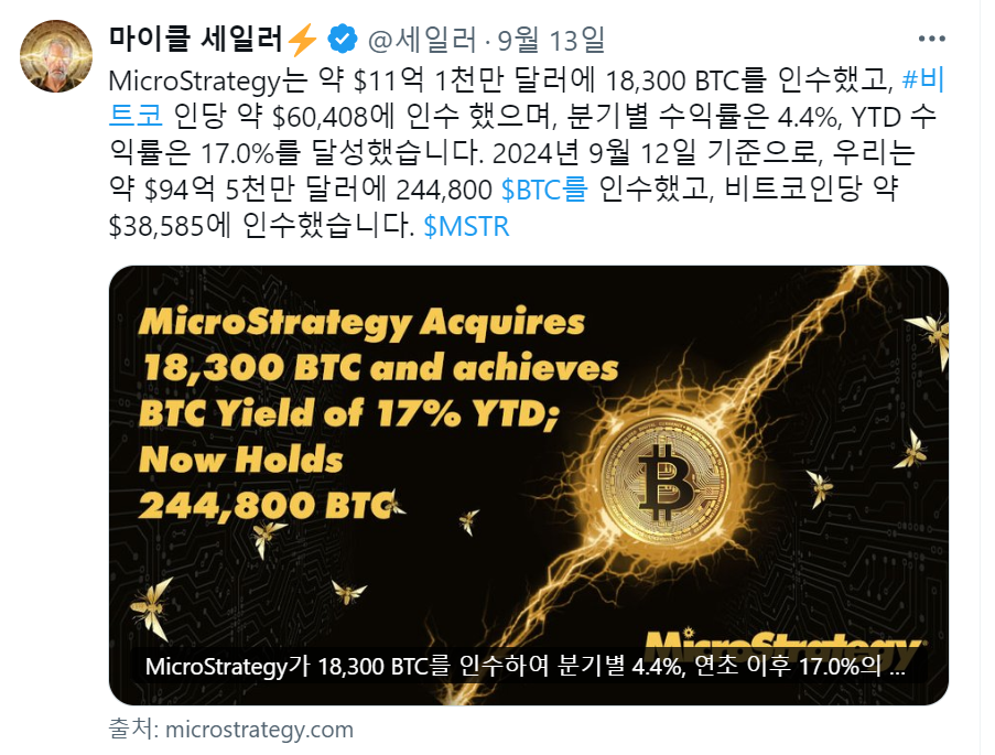 - 앞서 해당 기업은 지난 8월 6일~9월 12일 기간 11억 달러 규모의 비트코인을 매수했다고 발표했다.