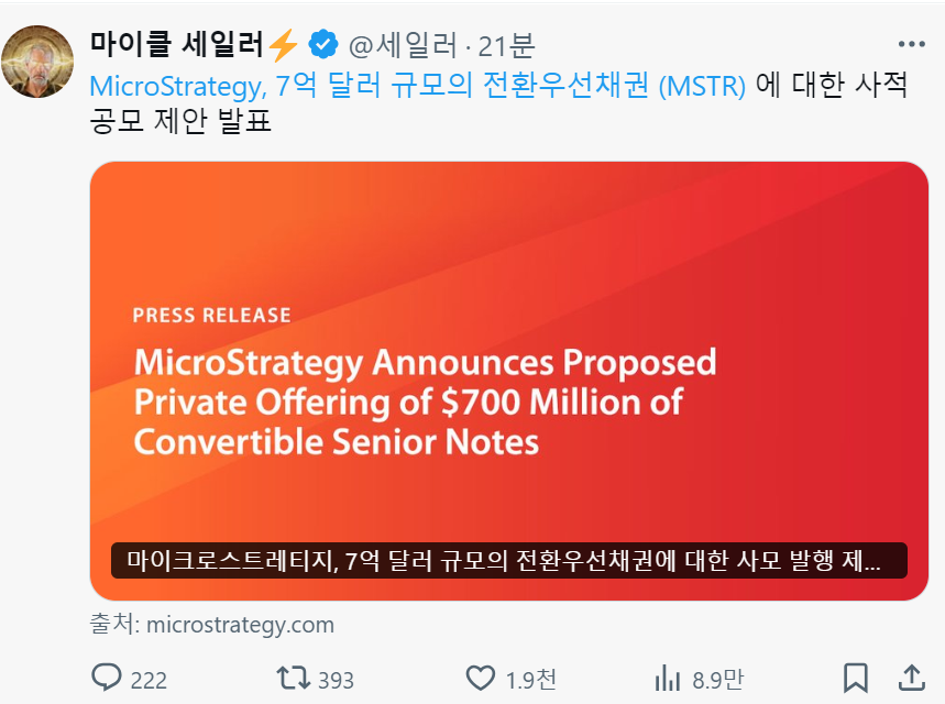 - 코인데스크에 따르면 비트코인 현물 ETF 제외 단일 기업 기준 가장 많은 BTC를 보유한 마이크로스트래티지(나스닥 티커: MSTR)가 7억 달러의 전환사채(2028년 만기)를 발행할 계획이라고 발표했다.
