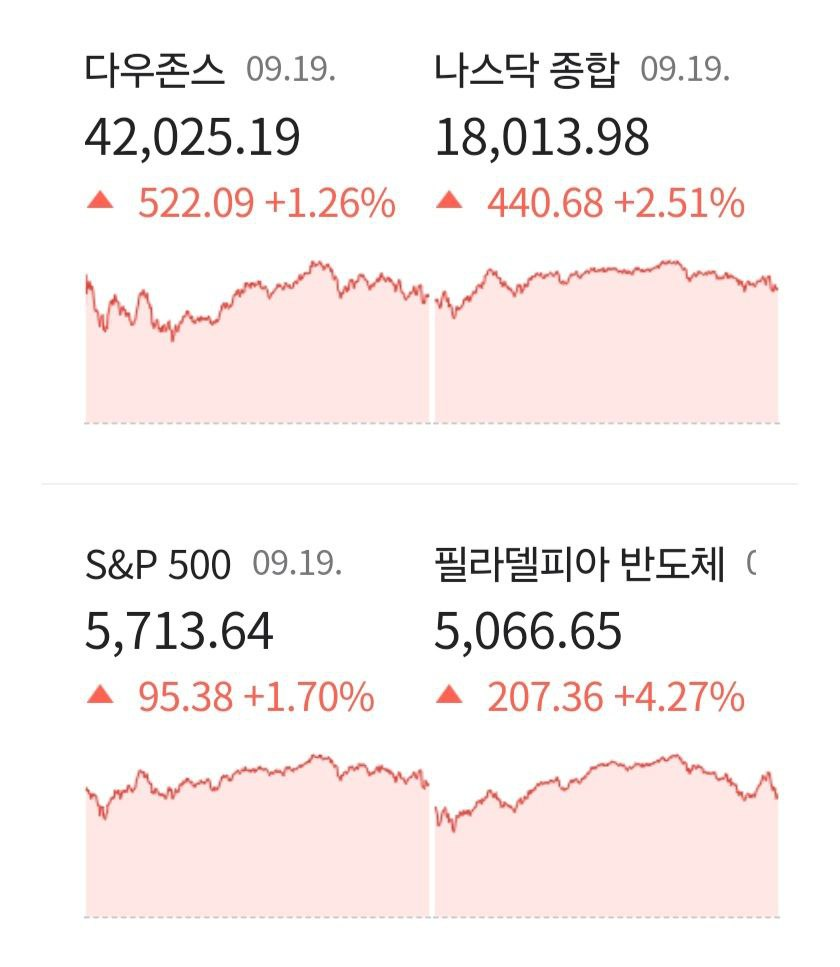 - 애플(+3.71%)도 금리인하로 경제 활성화 기대 심리가 부각되자 아이폰 16 판매 기대로 상승.