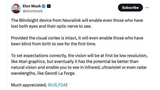 - 머스크는 이 기술이 시각장애인들에게 희망이 될 것이라고 밝혔음