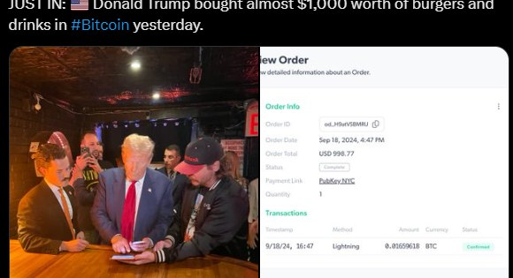 - 전날 도널드 트럼프 미국 전 대통령이 뉴욕의 암호화폐 테마 바인 PubKey에서 비트코인으로 버거를 구매한 가운데, 당시 그가 1,000 달러 상당의 햄버거 및 음료를 비트코인으로 결제한 것으로 알려졌다고 비트코인매거진이 X를 통해 전했다.