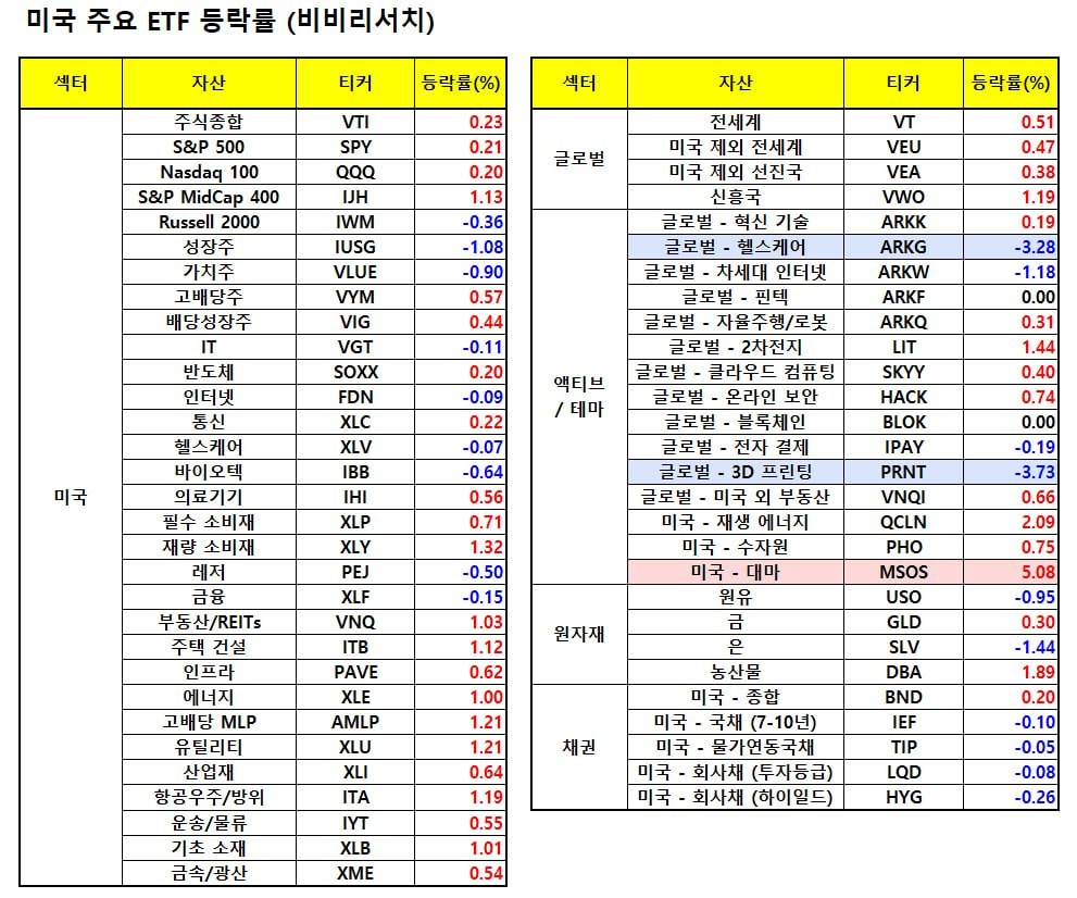 - 핀둬둬(+2.40%), 알리바바(+2.04%), 징동닷컴(+4.24%)등 중국 소매 유통업체는 물론 샤오펑(-0.42%)을 제외한 니오(+0.76%), 리 오토(+3.06%)등 전기차 업종, 바이두(+2.37%), KE 홀딩스(+7.52%)텐센트 뮤직 엔터(+3.25%)등 중국 기업들은 대부분 상승.