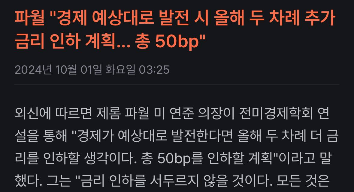 - 파월, 다음 금리인하 폭은 0.25%p가 될 것임을 시사
