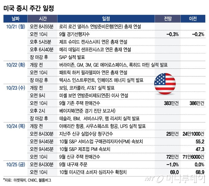 - 이번주 경제지표로는 21일에 9월 경기선행지수가 나오고 23일에 기존 주택 판매건수와 연방준비제도(연준)의 경기 진단 보고서인 베이지북, 24일에 9월 신규 주택 판매건수, 25일에 10월 미시간대 소비자 심리지수 등이 발표된다.