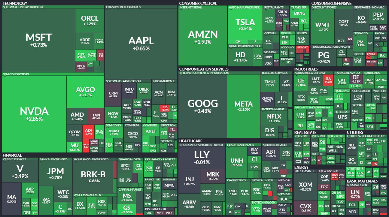 - 엔비디아(+2.85%)는 공급업체 아스테라 랩스(+37.70%)가 강력한 실적을 발표하자 상승.