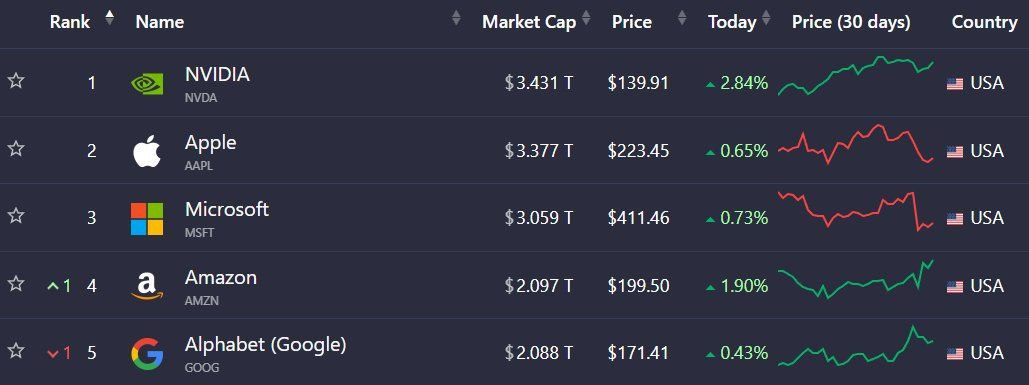 - 엔비디아, 시총 3조4000억 달러 돌파하며 애플 제치고 세계 1위 기업 등극
