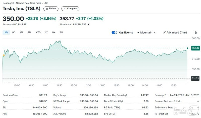 - 미국증시는 공화당 도널드 트럼프 전 대통령의 대선 승리 이후 주식시장은 랠리 지속중, 트럼프 수혜주로 여겨지는 테슬라는 이날도 9%대 급등