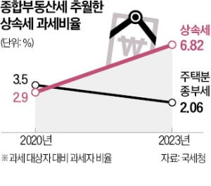 4. 상속세 대상자 비율, 종부세 대상자 비율 역전 → 대표적 부자 과세인 두 세금... 아파트 값이 급등하는 가운데 종부세는 완화 조치 등이 있었지만 상속세는 세율과 과표가 1999년 이래 제자리에 머물면서 대상자 급증. 전체 피상속인(사망자)의 6.82%가 과세 대상.(한경)▼