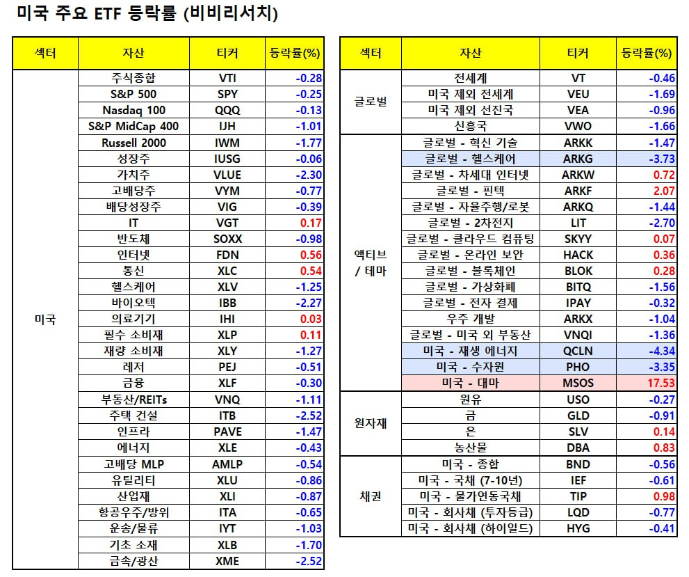 - 일라이릴리(-1.63%), 화이자(-0.19%)는 원격진료 처방 플랫폼이 상원에서 ‘잠재적 사기’로 조사 중이라는 소식에 하락.