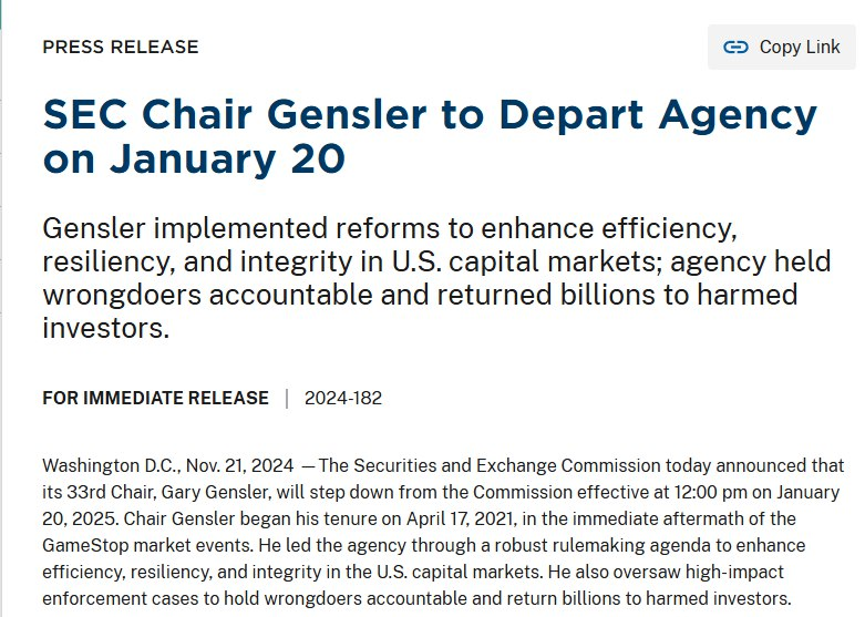 - - SEC 의장 개리 갠슬러 본인 임기 2026년을 마치지 않고 트럼프 취임에 맞춰 내년 1/20 사임 발표. 증시 및 특히 크립토에 호재. 발표 후 고점 징후를 보이며 하락하던 비트코인 상승 전환.
