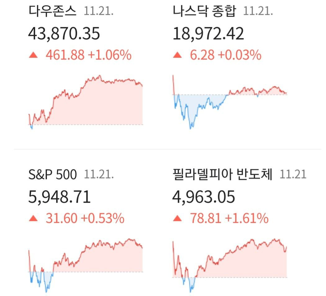 - 11/22 미 증시, 견고한 경기와 AI 산업 확산 기대 등으로 강세