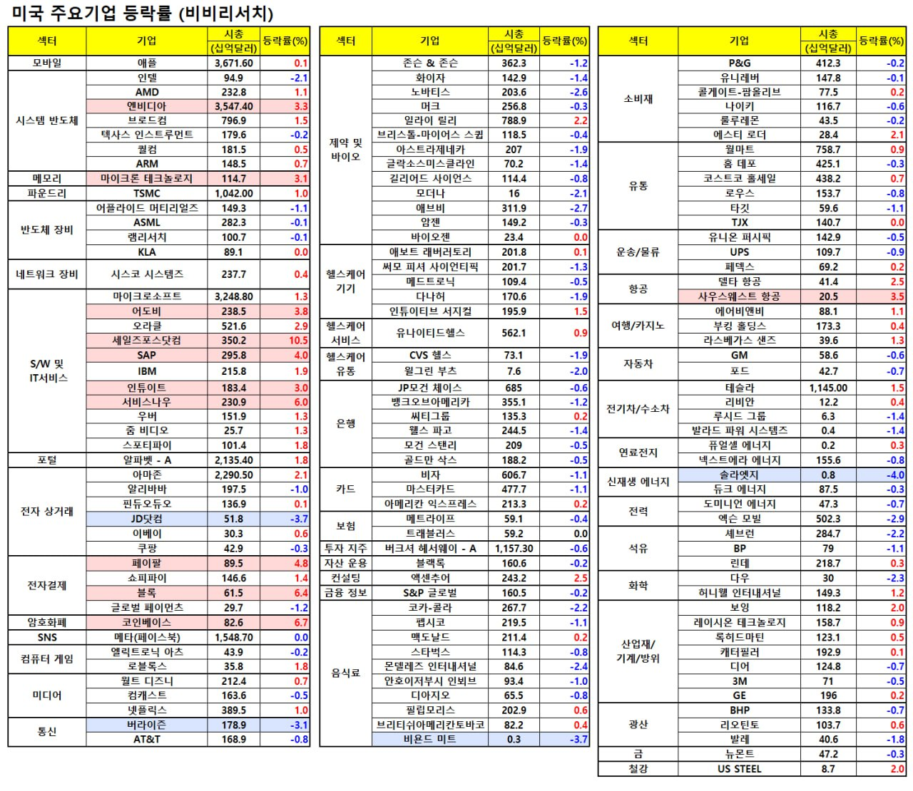 - 특히 세일즈포스(+10.99%)와 마벨테크(+23.19%)가 AI 산업의 확산 기대를 반영하며 큰 폭으로 상승하자 반도체와 소프트웨어 업종이 이를 주도.