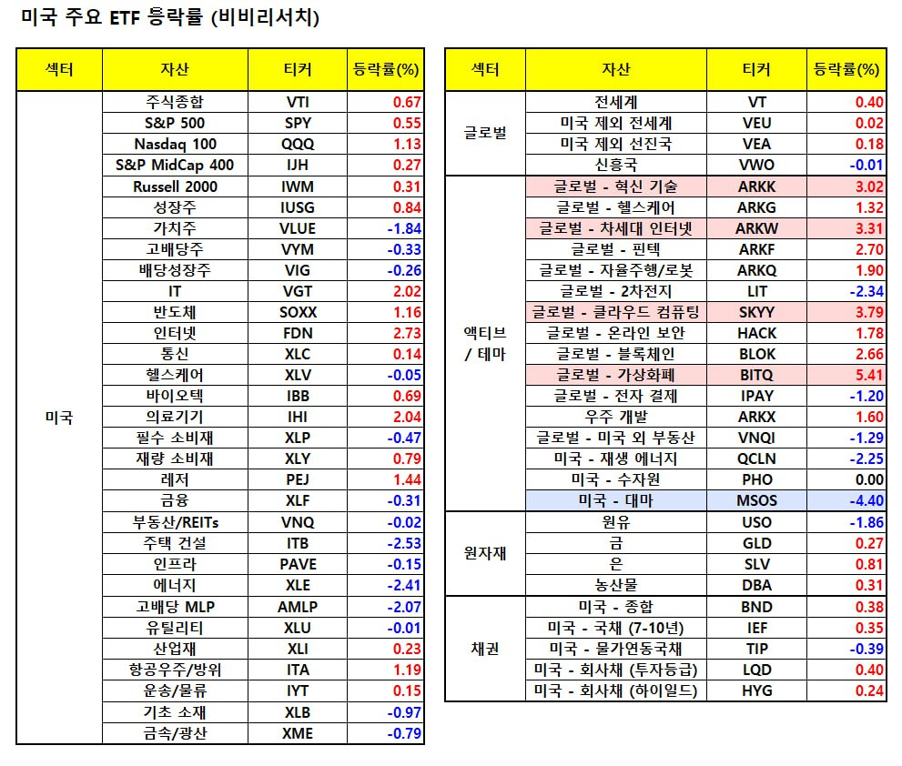 지난밤 글로벌 주요 ETF 동향 (비비리서치)