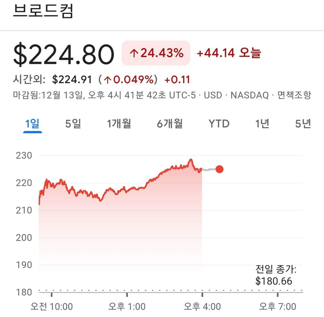 - 나스닥 0.12% 상승…브로드컴 24% 폭등, 시총 1조달러 돌파