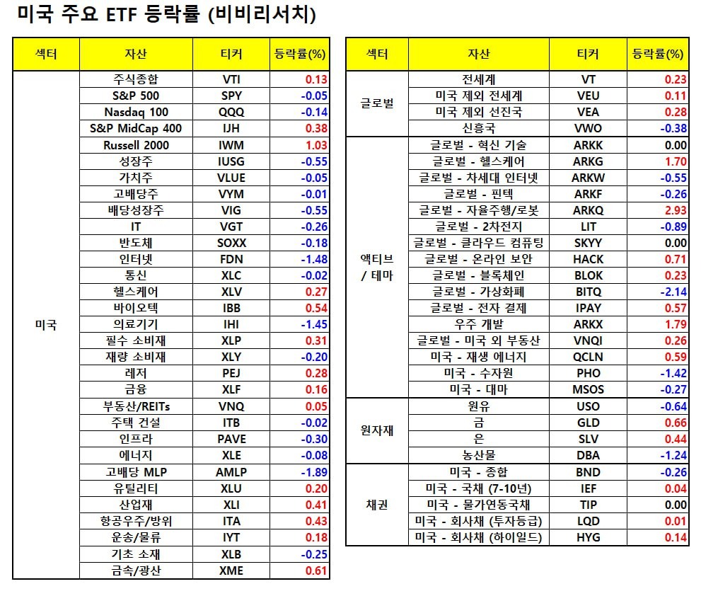 - 최근 상대적으로 약세 흐름을 보였던 소형주 중심의 러셀2000 지수가 +0.88% 오르며 다른 지수대비 좋은 성과를 보였습니다