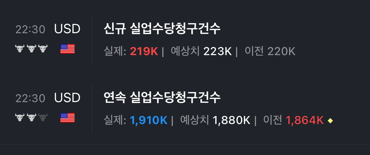 - ✔️이날 발표된 주간실업수당청구건수는 219K건으로 예상치 225K건을 하회했지만 계속청구건수는 3년래 최고 수준을 기록하며 엇갈린 모습을 보였습니다/ 국채금리는 보합권 내지 소폭 약세 흐름을 보였습니다