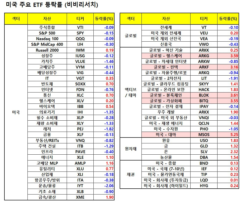 - 마이크로스트래티지(+3.59%), 코인베이스(+3.59%), 갤럭시 디지털(+3.48%), MARA(+2.62%), 하이브 디지털(+8.42%), 라이엇 플랫폼(+2.45%)등은 비트코인 상승에 강세.